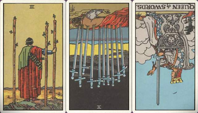 牌:权杖三+ 宝剑十- 宝剑皇后-