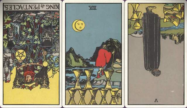 牌:星币皇帝- 圣杯八+ 圣杯五-