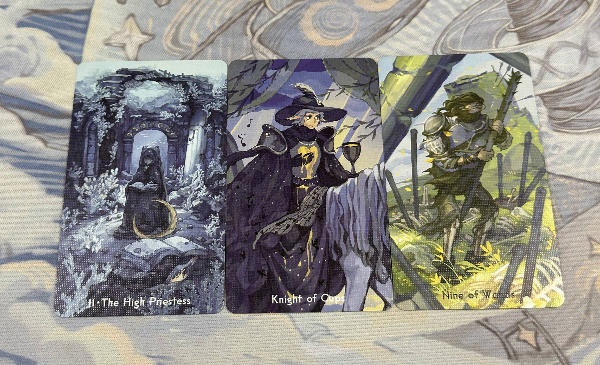 牌:女祭司+ 圣杯骑士+ 权杖九+