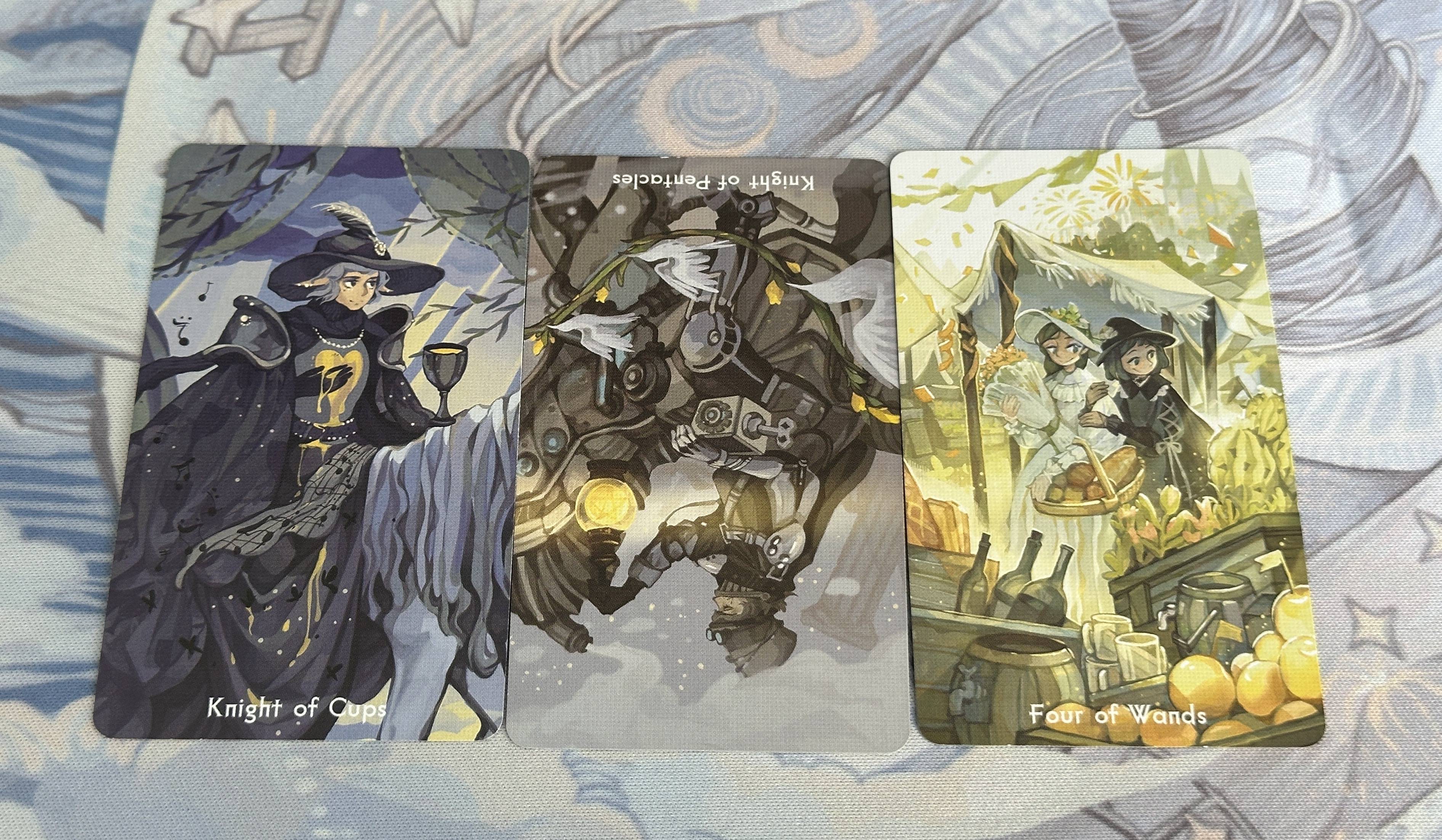 牌:圣杯骑士+ 星币骑士- 权杖四+