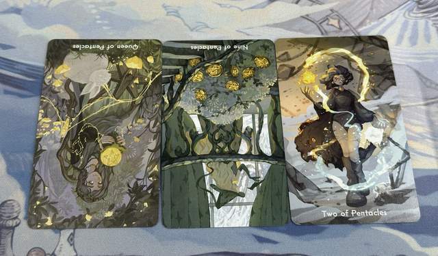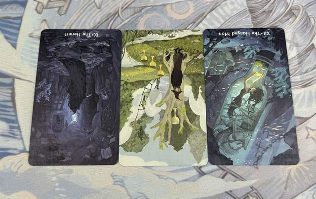 牌:隐士- 圣杯四- 倒吊人-